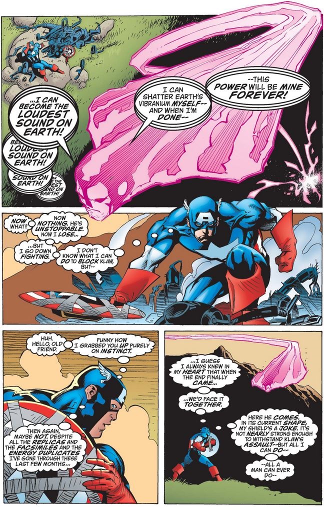 As the “vibrational cancer” approaches, it powers up Klaw, who prepares to demolish the vibranium mountain himself. For his part, Cap grabs his old shield and prepares to repel Klaw as best they can, even it means the end for both of them.
