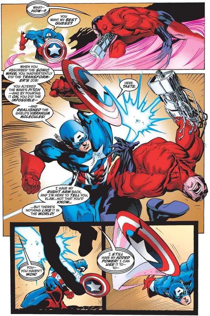 He soon finds himself and the machine attacked by Klaw, to whom vibranium is like kryptonite (which is actually said by one of his prison guards, confirming once again the existence of DC Comics in the Marvel Universe). Klaw wants the vibranium to be destroyed—and also relishes the thought of the destruction of his old foe’s homeland—and after he demolishes Tony’s machine, Cap loses it (understandably, given the stakes).