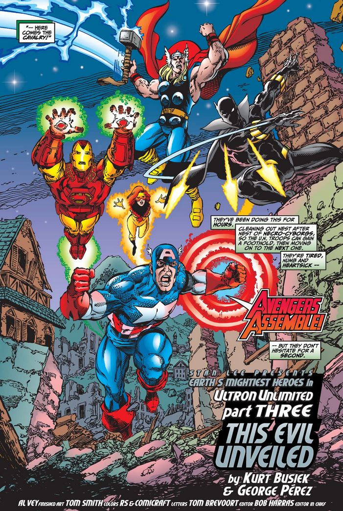 Avengers (vol. 3) #21, October 1999: Kurt Busiek (writer), George Pérez (pencils), Al Vey (inks), Tom Smith (colors), Richard Starkings and Comicraft (letters). (More details at Marvel Database.)