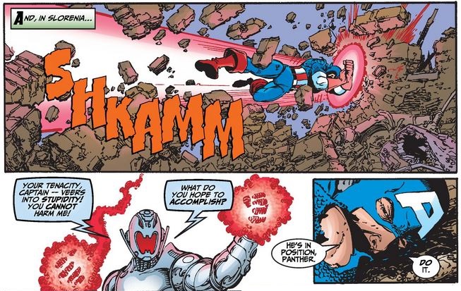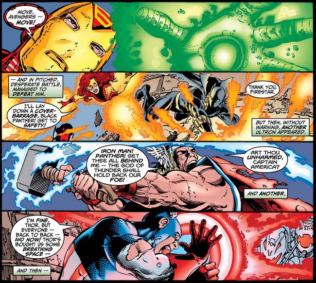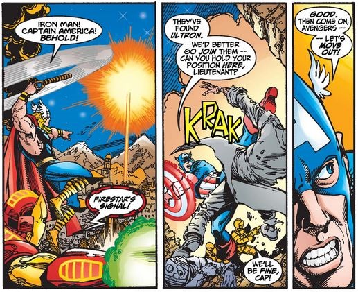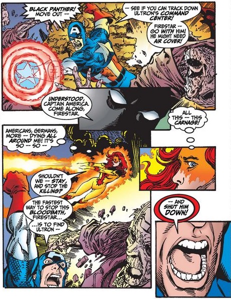 After Cap tells Black Panther and Firestar to find Ultron, the latter wonders if there isn’t a more immediate problem to be addressed, and Cap explains the long game (fully aware of the short-term costs).
