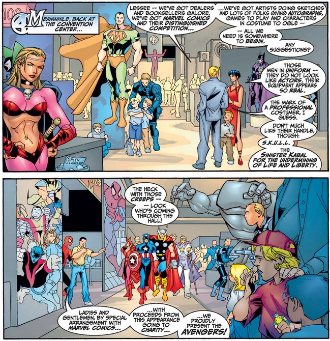 Then we find out why, starting with Johnny Storm explaining SDCC to Alysande, a Scottish highlander from another dimension whom the team rescued from captivity and now takes care of Franklin, who is also with them. (Note the cute “M-uperman” standee and the “Distinguished Competition” mention from Johnny.) Soon the actual Avengers arrive…
