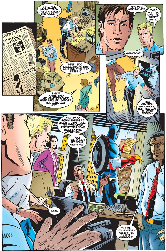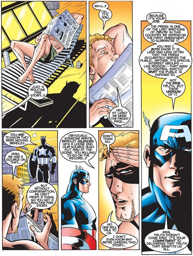 The next day, Cap pays a visit to Franken and questions his bland and vague story on the events. Franken argues they reported on all they could, given the lack of verifiable sources, but when he wonders why they’re even working on the Roxxon connections, Cap reminds him of the importance of diligent journalists in the face of increasing corporate influence over the media.