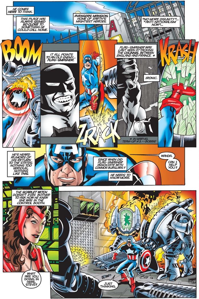 Cap goes to his quiet place and puts together what he’s learned (somehow skipping Flag-Smasher’s apparent death in X-Man #35 after his appearance in Marvel Team-Up #3, but before his “return to the states” in X-Men Unlimited #22).