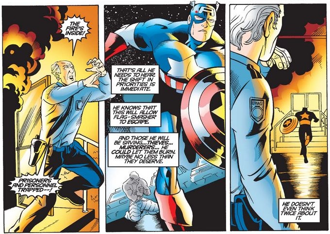 …but soon has to devote his focus to saving those trapped in the fire, even the inmates who might have committed vicious crimes but whose lives are no less worth saving. (It would be interesting to see what he would do if he could not save everybody and had to consider prioritizing those with “cleaner slates,” a question he side-stepped back in Captain America #325.)