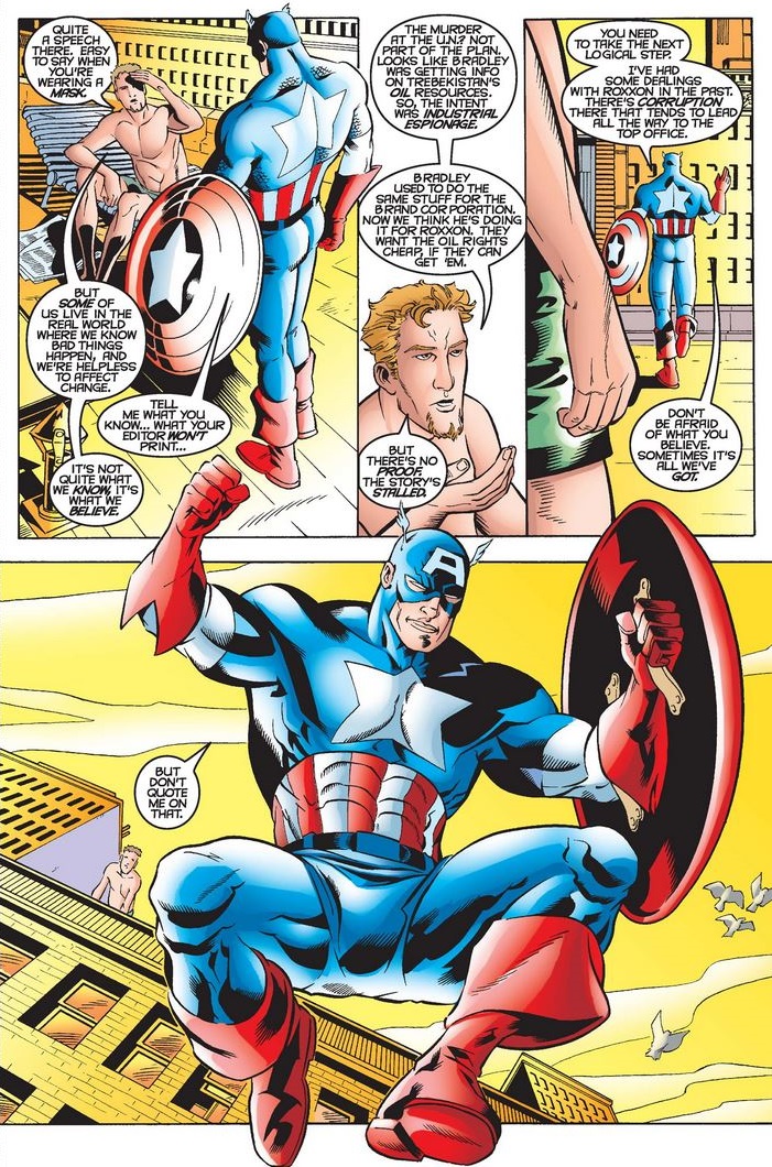 Cap starts investigating the arrested man and his connections to Roxxon Oil while the journalists do the same, during which time they briefly discuss the Star-Spangled Avenger who is also the Living Legend of World War II to the older set.