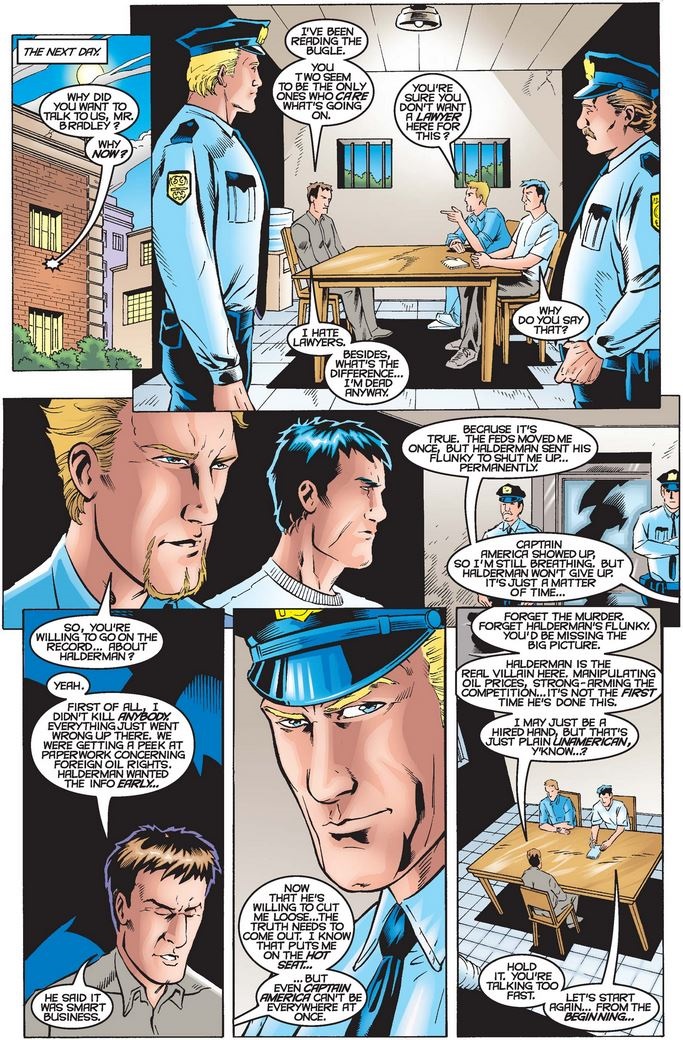 Cap’s words inspire Franken and Davis to question Halderman, who laughs them out of his office after telling them governments and borders no longer exist (sound familiar?) and corporations are all that matter any more. Things look up when Bradley asks to talk to them, assuming he doesn’t have long to live…