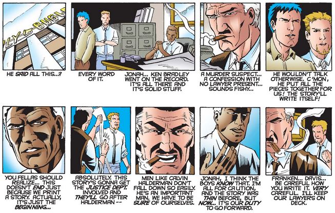 …but after Bradley is killed in prison, Roxxon sues the Bugle, and Jameson has to play defense, although he stands by the story.