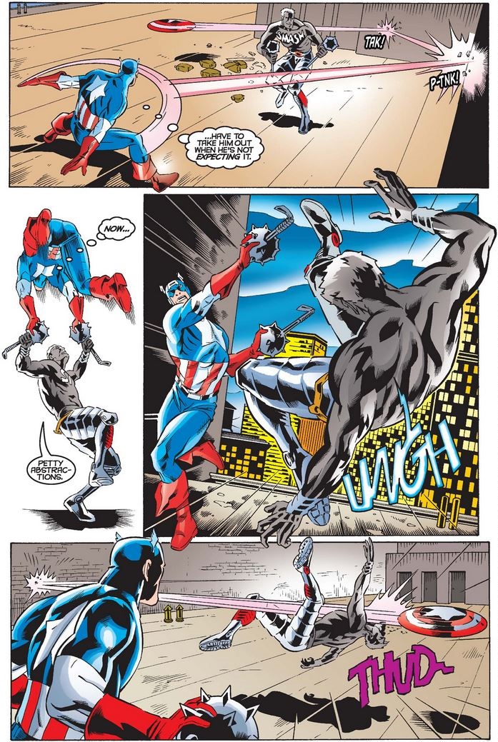 Regardless, the information Cap gave Bradley “on background” convinced Jameson to press on with the story. Halderman does send Flag-Smasher to the Bugle, but Cap is there to meet him, and after a long fight Cap takes him out with some crafty shieldwork.