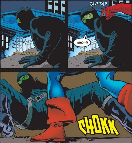 The shadows seem to represent Cap’s mood this night, as he cuts the rope holding up the thief…
