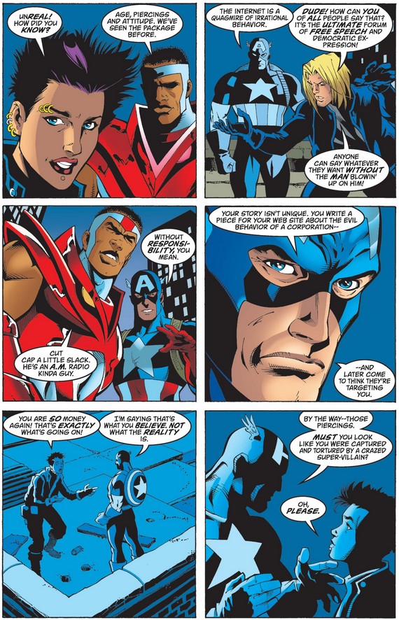 Given Cap’s personal experience with conspiracies at the highest levels of the American government, you’d think he might be less skeptical of what Dawn and Josh have to say, but unfortunately, he and Sam focus on how they look. (However, Cap is right about the internet, readers of this fine blog aside.)