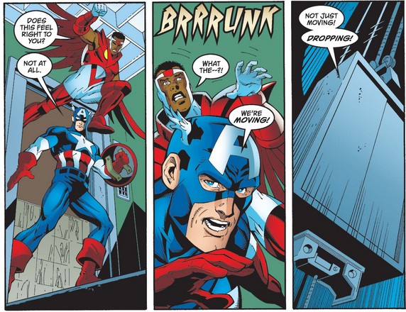 Unfortunately, holding their breath in the elevator did not prevent the gas from seeping through this skin, and Cap and Sam soon succumb to its effects.
