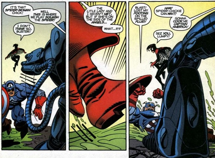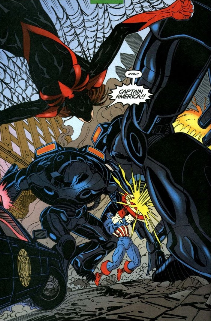 In this month’s Spider-Woman #15, Mattie Franklin, the current holder of that mantle following Jessica Drew and Julia Carpenter, comes across Cap fighting different killer robots (Mandroids, to be precise)…