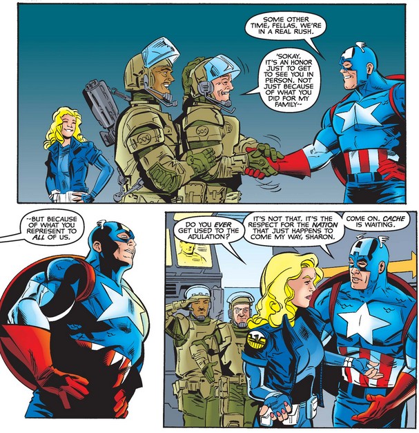 Despite being in a hurry, Cap shakes hands and makes sure they feel recognized, and one of the guards tells him what he means to all Americans. When Sharon asks him about it, he deflects the praise, writing it off as reflected love of the country (which even I think takes his humility a little too far).