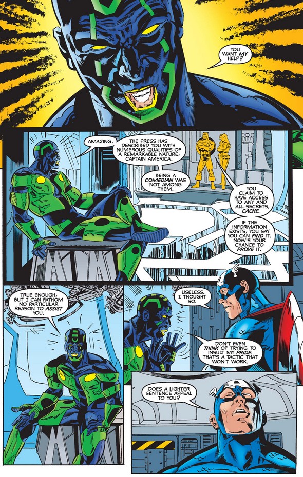 Yes, his source is Cache, the supercomputer come to life from the last two issues, who possesses all the information on every computer in the world. And he is more than surprised at Cap’s request as well as his eventual offer—which is a bit surprising in general, given Cap’s general disapproval of legal shenanigans that interfere with the proper execution of justice.