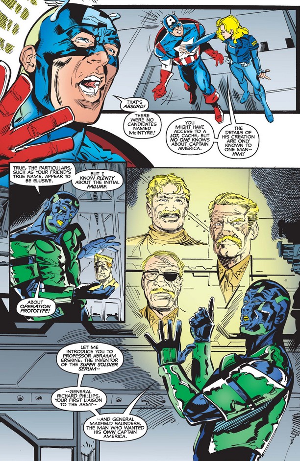 Cache refuses to tell Cap who was responsible for reviving McIntyre, but does warn him that he will be very hard to defeat, especially because the serum enhances his antisocial personality traits (as it did Rogers’ virtuous ones)—a challenge Cap readily accepts.