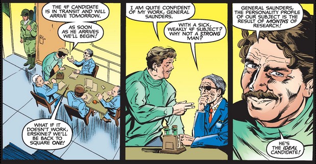 Turning back to the three men at the origin of Project Rebirth, Erksine emphasizes the importance of finding a candidate with ideal character traits or virtues, while Saunders introduces another perspective to the story, focusing on strength alone.
