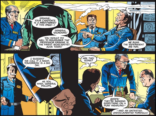 …whom Cap does not recognize. Sharon calms his down and challenges Cache, who introduces the other players in the story: Professor Erskine and General Phillips, whom we know, and General Maxfield Saunders, who is new.