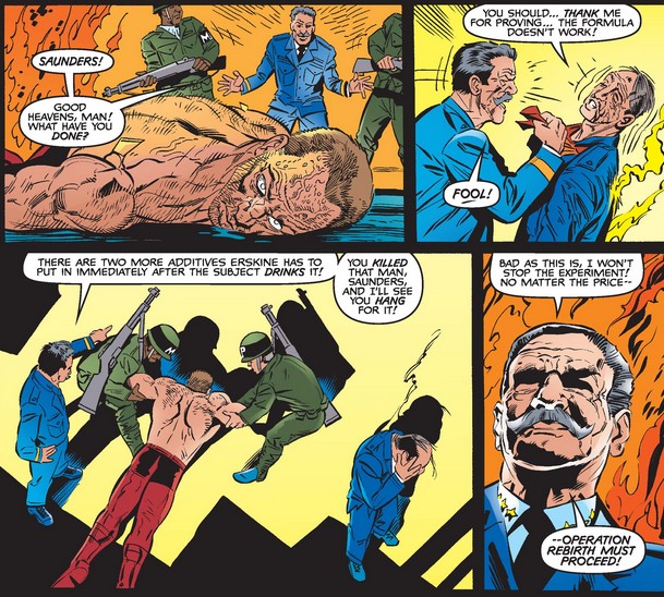 McIntyre is injected with the serum, but either because it’s incomplete or it was not followed up with Vita-Rays (similar to what happened to William Burnside, the 1950s Cap), he has a bad reaction. He loses control and lashes out randomly, and after rampaging outside in traffic, he collapses dead from a heart attack. When Phillips arrives on the scene he is horrified at what has happened, but his belief in Project Rebirth is not shaken (luckily for us!).