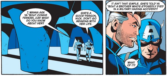 When Nick Fury shows up, he asks Cap about his girlfriend Connie Ferrari’s brother, whom Nick has been investigating in secret the last several issues…