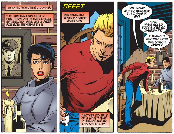 He asks point blank what (she thinks) happened to her brother, but before she can answer, he receives a summons on his pager, which explains some of his earlier thoughts about the impatient modern world.