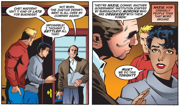 Before he can leave, one of Connie’s clients—the shady one who got them the baseball tickets in issue #35—shows up and throws around a term that Steve is understandably defensive about (absent any actual fascist implications).