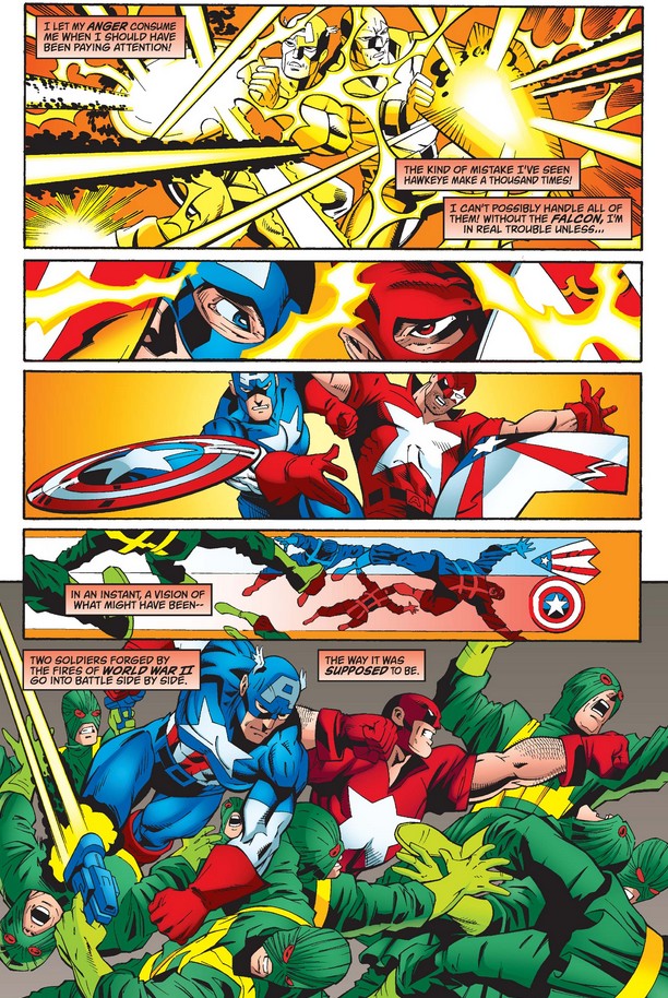 When Hydra fires on both of them, Cap beats himself up for making a Clint-sized mistake before seeing a glimpse of what could have been had things turned out as he imagined above.