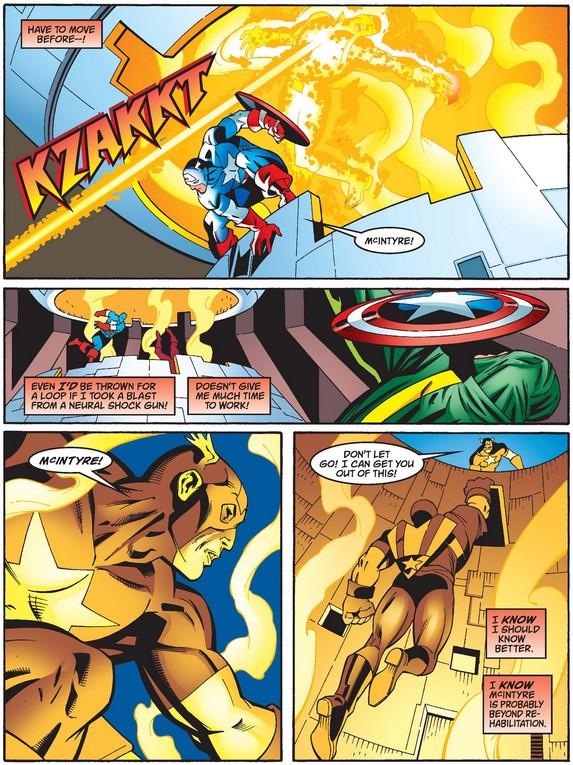 He nicely recaps Protocide’s origin for the reader, musing at the end about what might have happened had McIntyre received the same finished treatment Steve Rogers got.