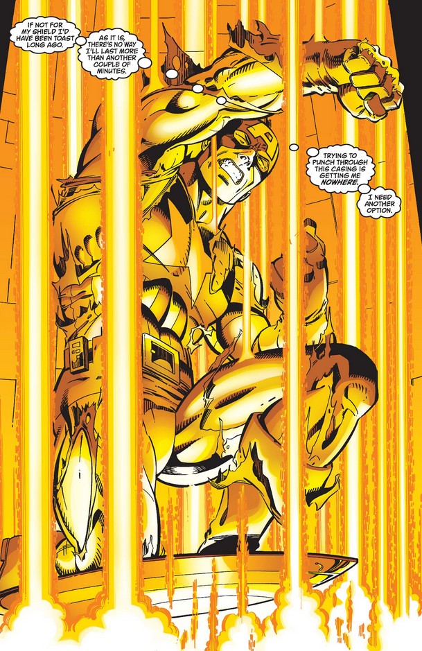 At the end of the last issue, in a Hydra warehouse, Protocide had defeated Cap and tossed him into the energy core Cap had just saved him from. The first sight of our hero is in the form of the stunning image below, courtesy of penciler (and writer) Dan Jurgens, inker Bob Layton, and colorist Gregory Wright.