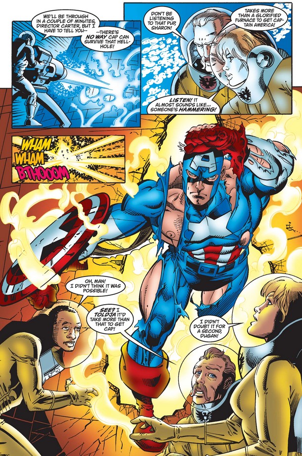 While SHIELD hits the structure from the outside, Cap bursts through from the inside, surprising only the SHIELD agent who does not know what Captain America is capable of.