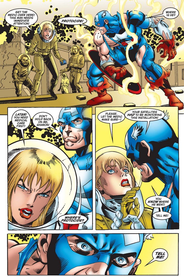 Cap tracks Protocide to a mountain AIM facility where he lays into the personnel—and turncoat SHIELD Agent Clete Billups, who found Protocide in first place. Meanwhile, Sharon realizes what Cap has strapped to his belt…
