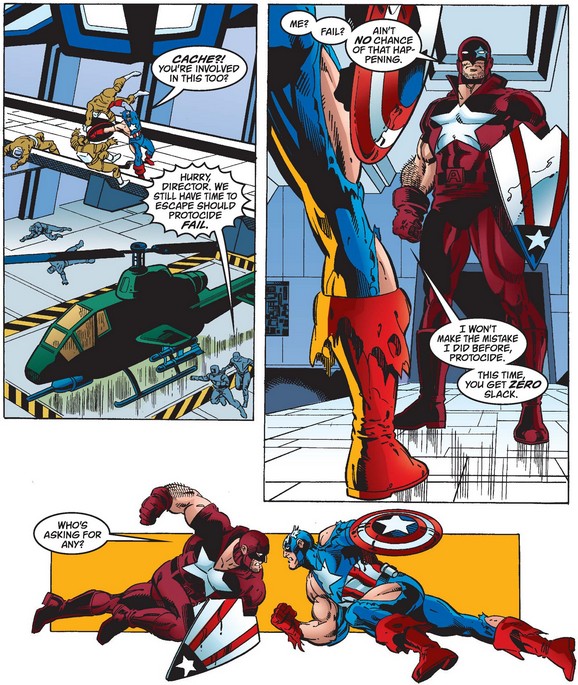 While fighting his way through the AIM agents, Cap sees his recent foe Cache (from issue #34 and the 2000 Annual) before confronting Protocide once again, this time giving him no benefit of the doubt as to his true nature (as he did in the last issue).
