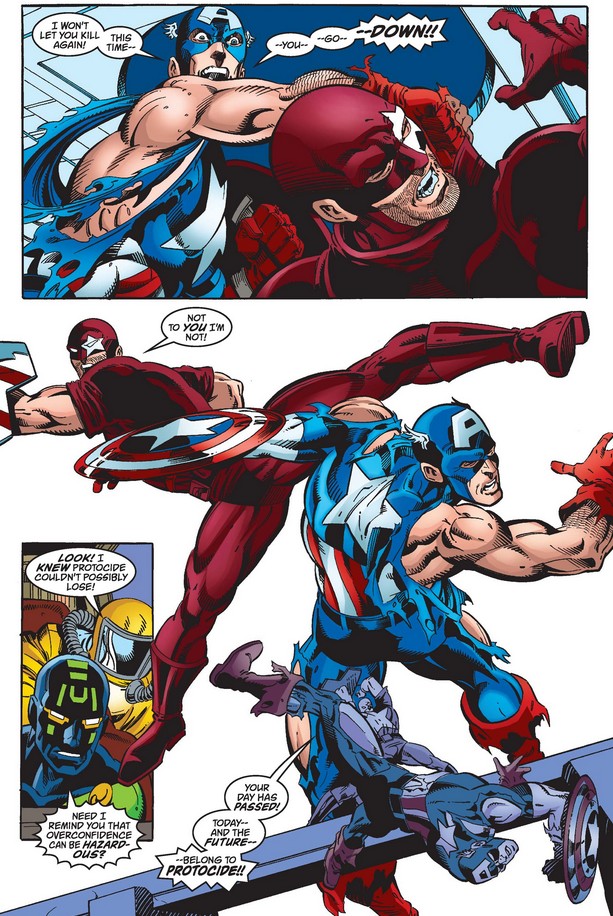 Having thrown Cap out of the underground bunker to his safety, Protocide seems to have perished in the ensuing explosion, to Cap’s dismay…