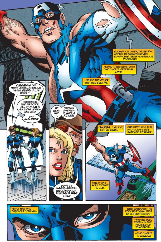 Finally, Cap thinks of using the Omega Compound, although it is unclear how seriously he actually considers it to be a viable option. (He did bring it for a reason, though.) Although it is the easiest way to stop Protocide, he clearly realizes not only that it would mean the death of his foe and many others (including himself, which he likely doesn’t consider), but it would also have disastrous ramifications for the more symbolic and existential considerations of who he is and what he stands for.