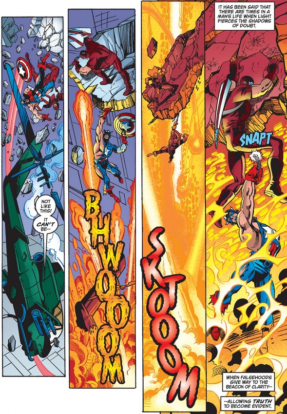 After he removes the helicopter’s rotor with his shield, Cap watches it fall and explode, sending flames up to where he and Protocide dangle from a collapsing platform, and now it falls on the latter to make a choice.