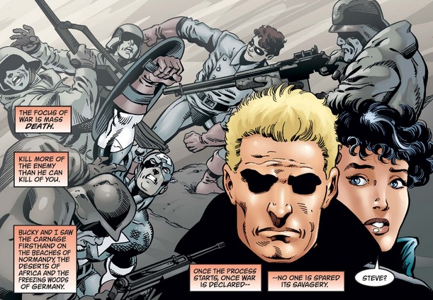 1. Some excellent commentary by Jurgens de-glorifying warfare. Reminds me of a quote from Star Trek (written by a WW II vet): “Death, destruction, disease, horror. That’s what war is all about. That’s what makes it a thing to be avoided!” Jurgens art is soothing on the eyeballs and his run had some interesting story beats even though it continued the slow march from “Cap, Superhero” to “Cap, Soldier” begun in Waid’s run.