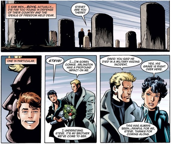 Cap reflects on the horrors of war, both to the combatants that suffer physical, emotional, and moral injuries, as well as the communities that are ravaged and devastated. (Does his face below remind anybody else of a Gil Kane drawing?) He concludes by remembering those who gave all to their country as he flashes back to a visit earlier that day as Steve Rogers to Arlington National Cemetery with Connie to visit what she thinks is her brothers’ grave…