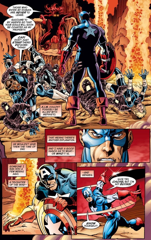 After they fall through a melted floor, Cap and the Agents of SHIELD find themselves in the realm of Mephisto… but Cap isn’t buying it, having been trapped in an artificial environment too recently to fall for it again.
