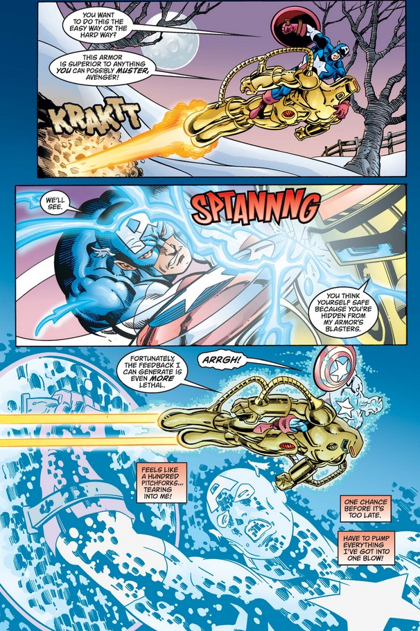 …the director of AIM in Mandroid armor, who takes our hero for a spin. Cap’s legendary perseverance allows him to push through the pain from an intense electrical charge…