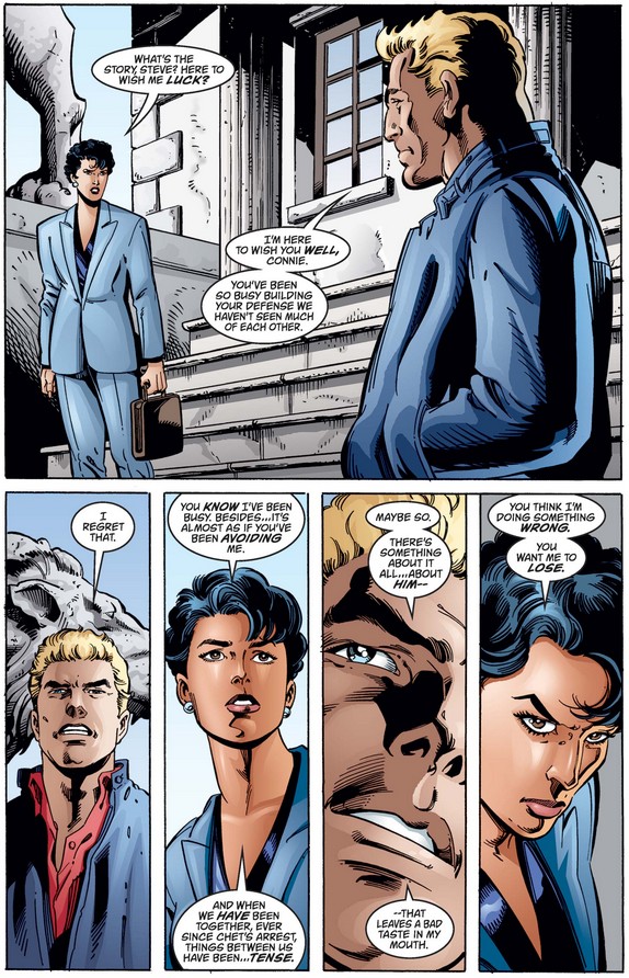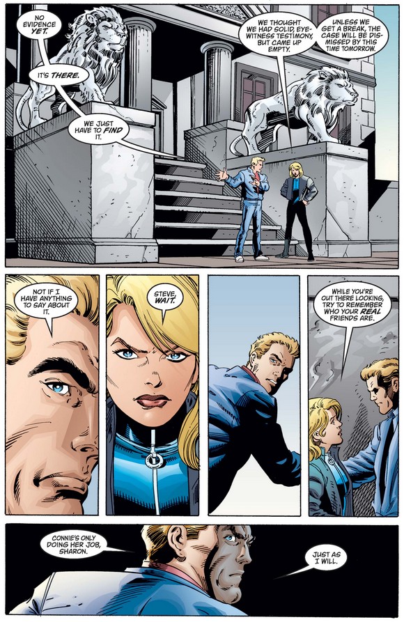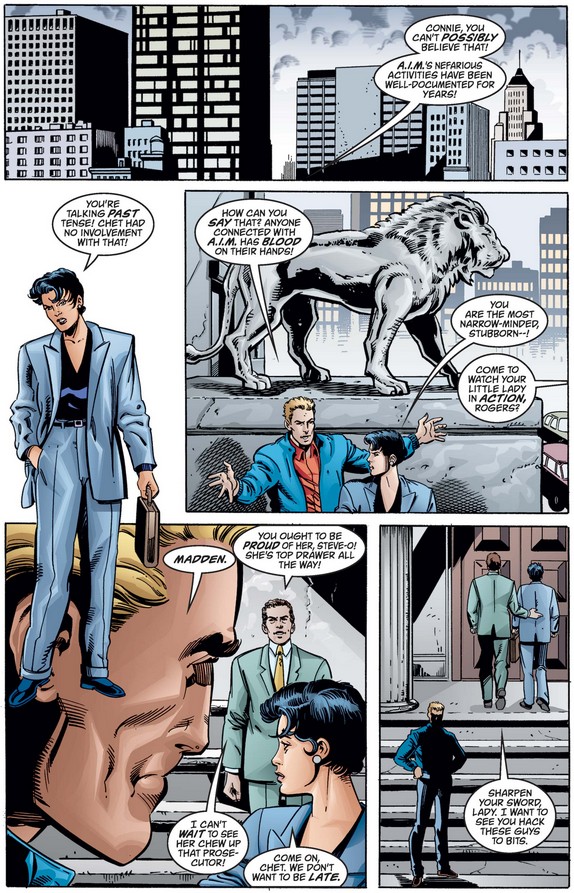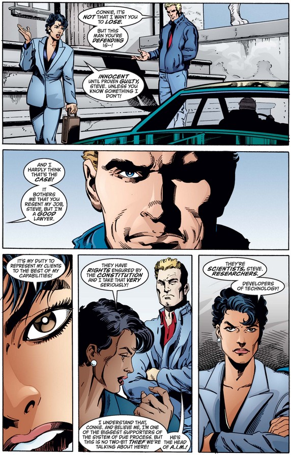 Despite what he says below, Steve does want Connie to lose, because as Cap he witnessed Madden commit crimes in the last issue, although he can’t reveal he knows that. Regardless, he misses the point of defense counsel and the Constitutional right to it: defense lawyers don’t exist to “get bad guys off,” they exist to discipline the prosecution by challenging their arguments, mounting a vigorous defense to push the prosecution to make the best case they can, which increases the chances that the jury’s verdict will be accurate and justice will be served.