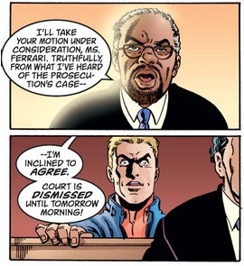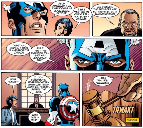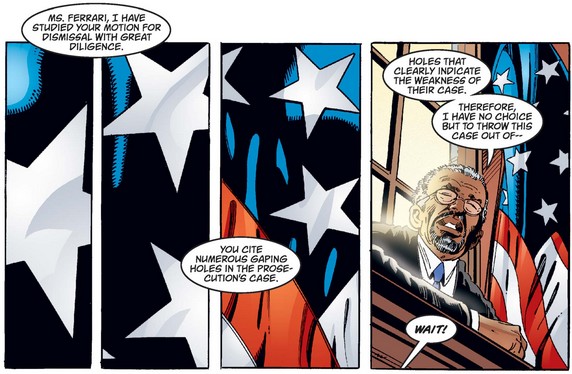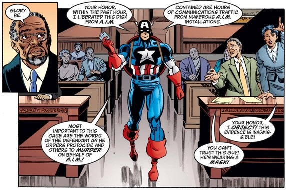 After Cap prevents the AIM data engineer from hitting a big bright PURGE button on his control panel, the scene returns to the New York City courtroom, where the judge is just about to dismiss the case against Madden…