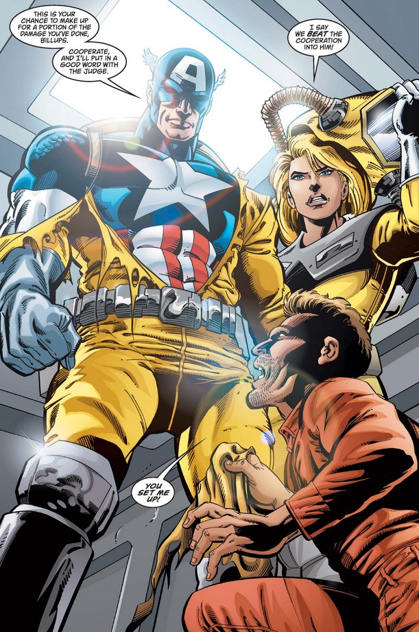Cap sounds like Connie below as he asserts Tony’s innocence until proven guilty (or even charged with crimes), and he admirably keeps his cool as Walders accuses him of dishonor in covering for Tony’s crimes out of financial motives or a superhero version of omertà.