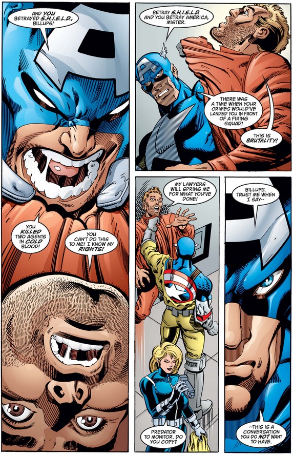 Cap’s depiction above only forecasts his mood below, as he ignores (but does not deny) Billups’ assertion of his civil rights and particularly resents his boast about his reliable attorneys.