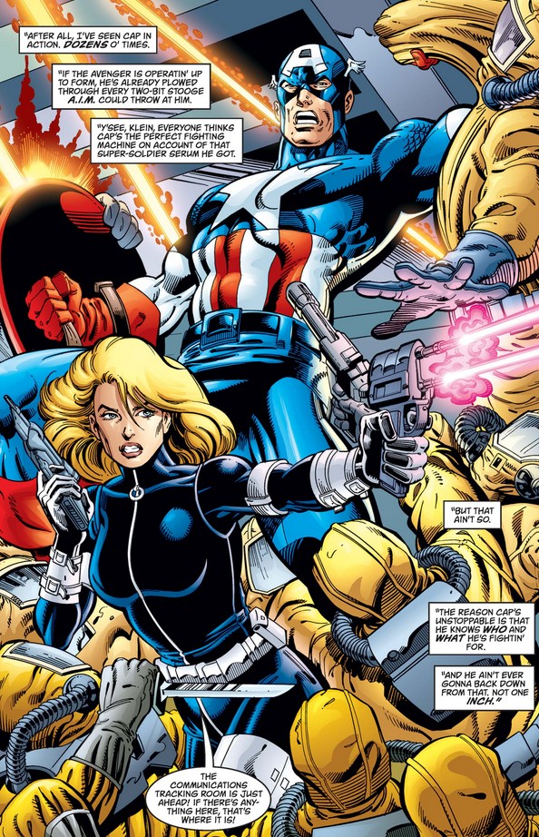 As Cap and Sharon fight through AIM personnel to get to the facility’s data center, Dum Dum Dugan explains to Klein that Cap’s resolve and dedication to purpose are what makes him formidable.