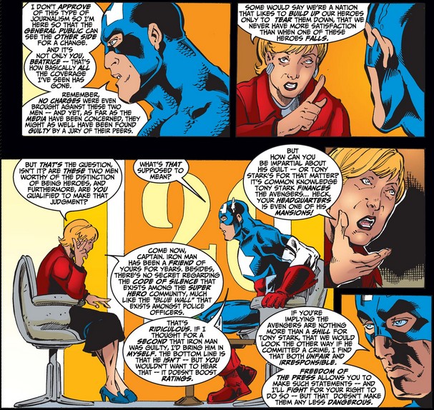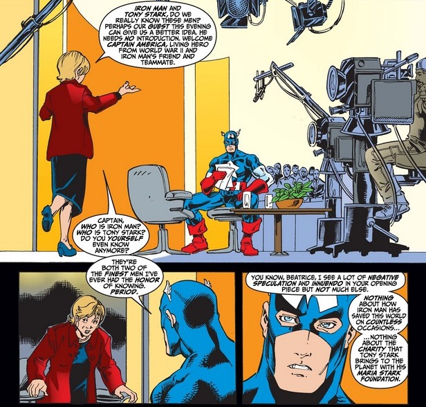 Come back for the next issue to see how this case is resolved, but for now, let’s check in with Iron Man #39, where both Tony Stark and Iron Man (his secret identity having been infamously restored several years ago) are under scrutiny from television personality Barbara Walters Beatrice Walders, who invites Cap to 20/20 20 Vision to ask him more about his longtime friend and colleague. Cap fights back straight out of the gate, standing up for the character of “both” men and citing the numerous examples of heroism and charity that Walders mysteriously left out of her scandal-filled introduction (omitted here).