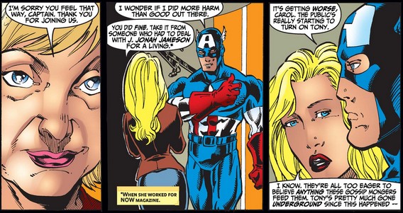 After he (very honorably) disputes her accusations while affirming her right to make them, Cap bemoans his performance to Carol Danvers, who assures him he did well but shares his pessimism about how things look for Tony (on which you can read the issue to learn more).