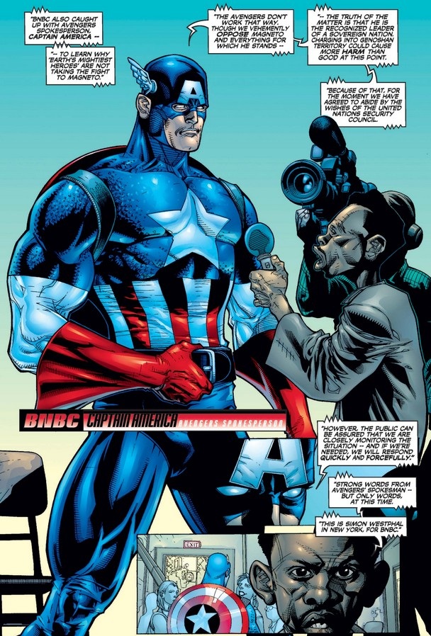 Finally, in X-Men #111, our newly appointed “Avengers spokesman” gives a very diplomatic statement on Magneto’s latest escapades as leader of the mutant island of Genosha and the team’s decision to abide with the United Nations’ directions to stay out of it (without needing any Sokovia Accords), while promising to keep an eye on developments to make sure they don’t go south.