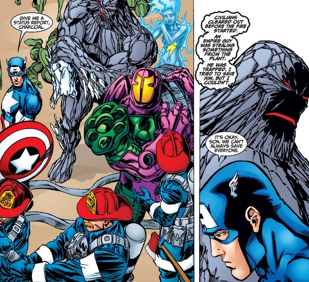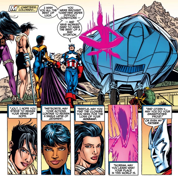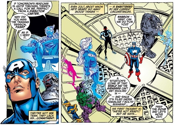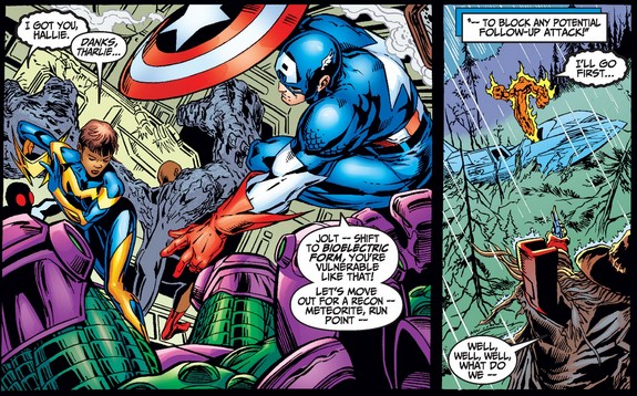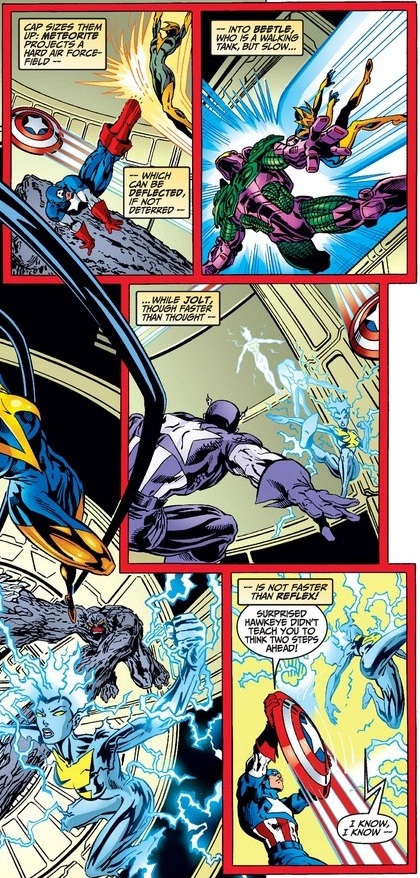 Cap continues reviewing the members of the team, focusing on Jolt in particular, whom he compares to his fellow Avengers Firestar and Justice and expresses optimism for her future prospects.