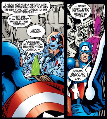 …concerning former Thunderbolts ally (and one-time Citizen V) Dallas Riordan, currently in Latveria. Given her troubled past with the team, Cap has to assure them that she is to considered a victim to be protected, not an enemy.