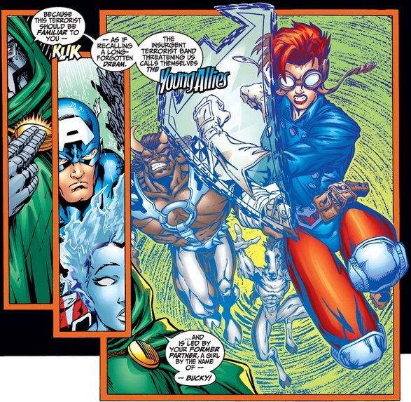…due to the identity of the eco-terrorist herself, Rikki “Bucky” Barnes, last seen in Heroes Reborn: Young Allies #1, although Cap does not remember her.