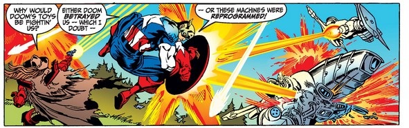 When issue #52 opens, Cap, the Redeemers, and Rebel are being attacked by robot drones which presumably were sent by Doom, although they are supposed to be working alongside Doom—and Cap trusts Doom, whether based on an all-too-common belief in the Latverian’s sense of honor (which I dispute here) or a more pragmatic estimate that betrayal this early in the game is not in Doom’s interest.